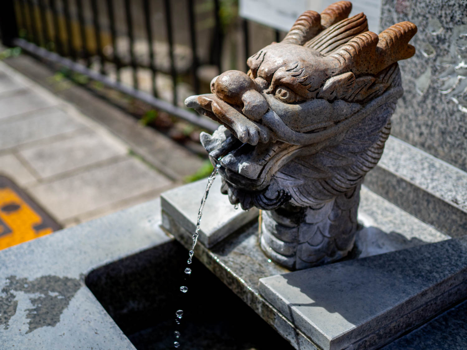 通りの奥に引用できる温泉を口から出している龍がいます。