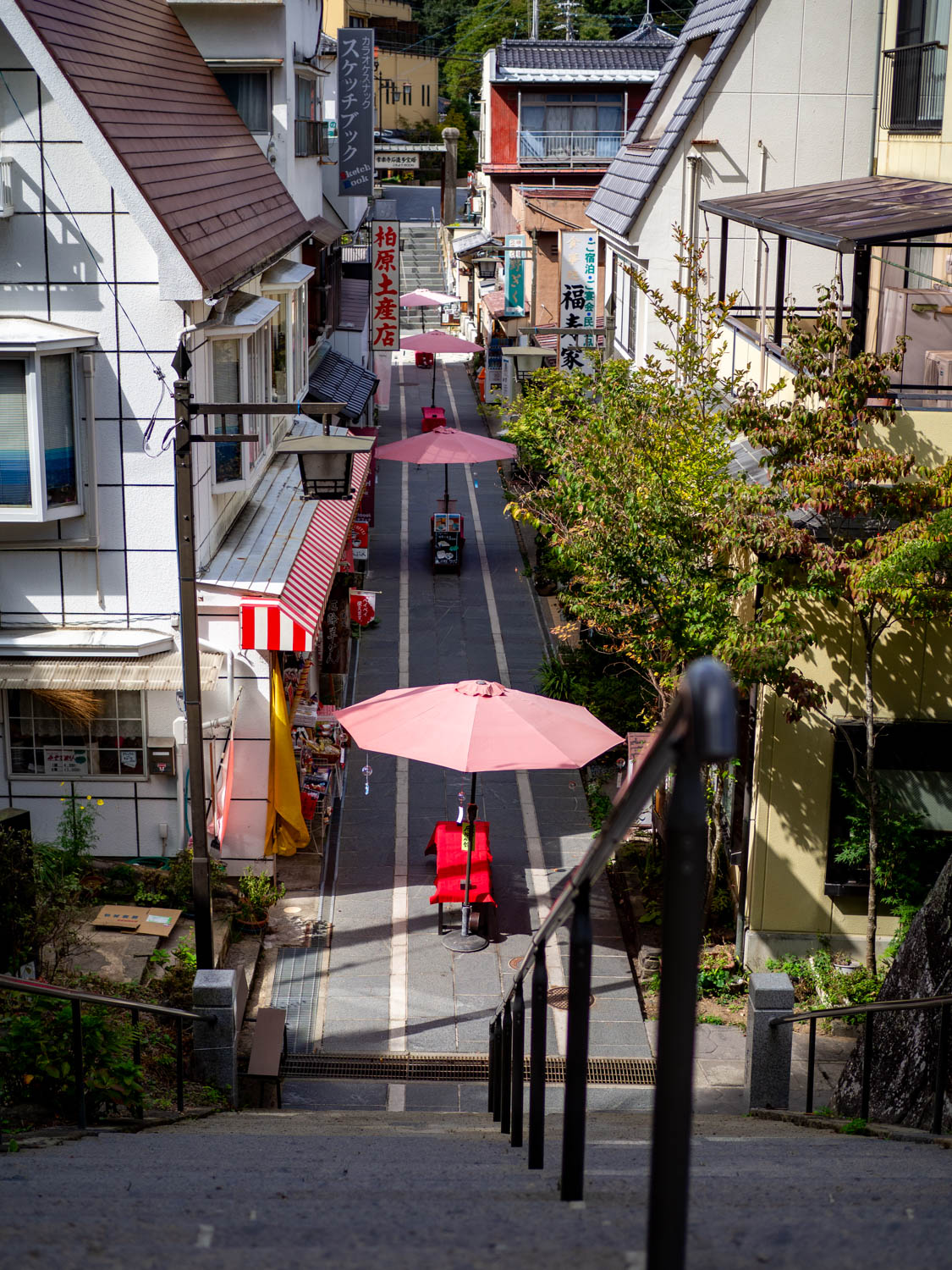 お寺の階段を上り切ると、小さな通りが全て見渡せます。