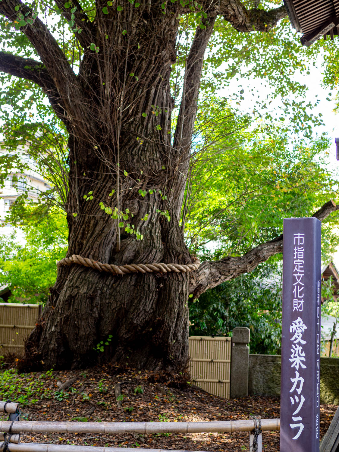 御神木の愛染桂。樹齢1200年の老木だそう。縁結びの霊木として愛され、昭和14年には長野県の天然記念物に指定。