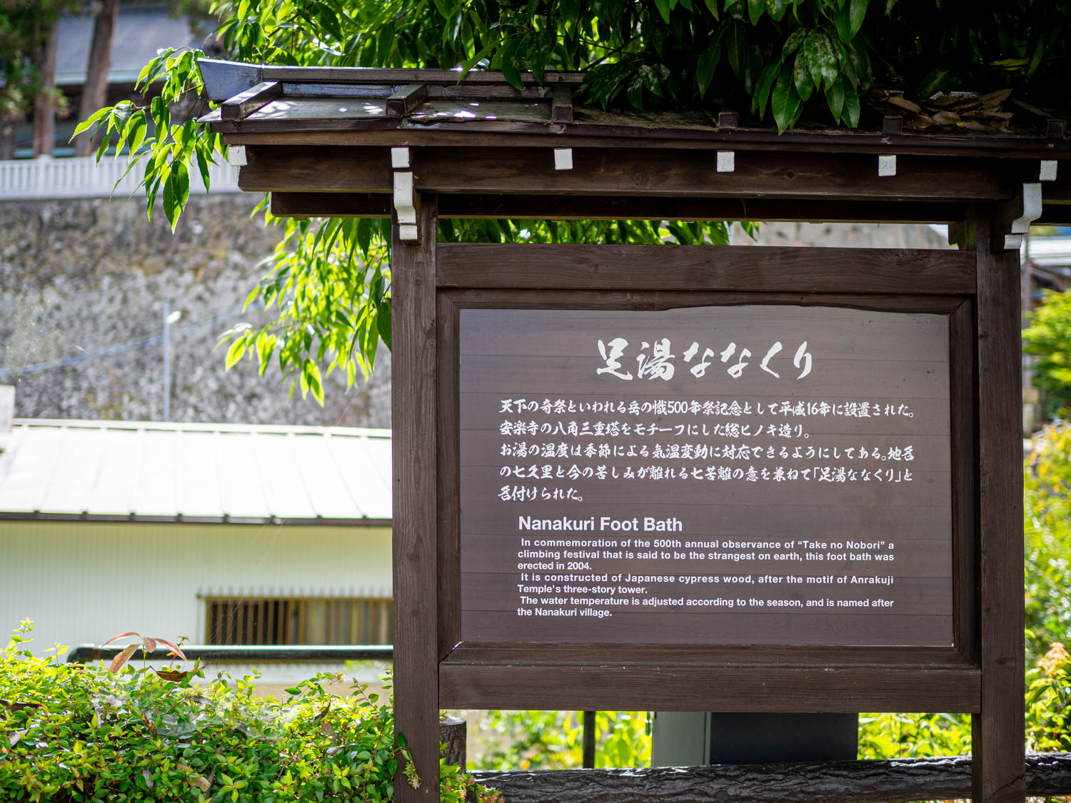 お湯の温度は季節による気温変動に対応できるようにしてあるそうで、地名の七久里と今の苦しみが離れる七苦離の意を兼ねて「足湯ななくり」と名付けられたそう。