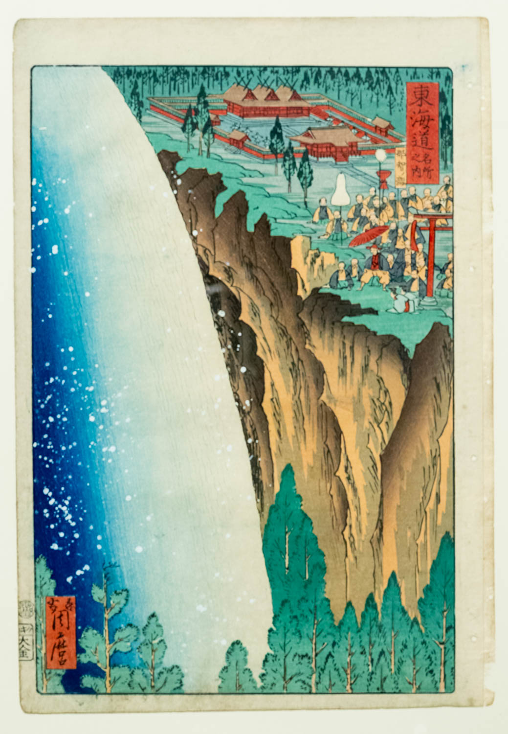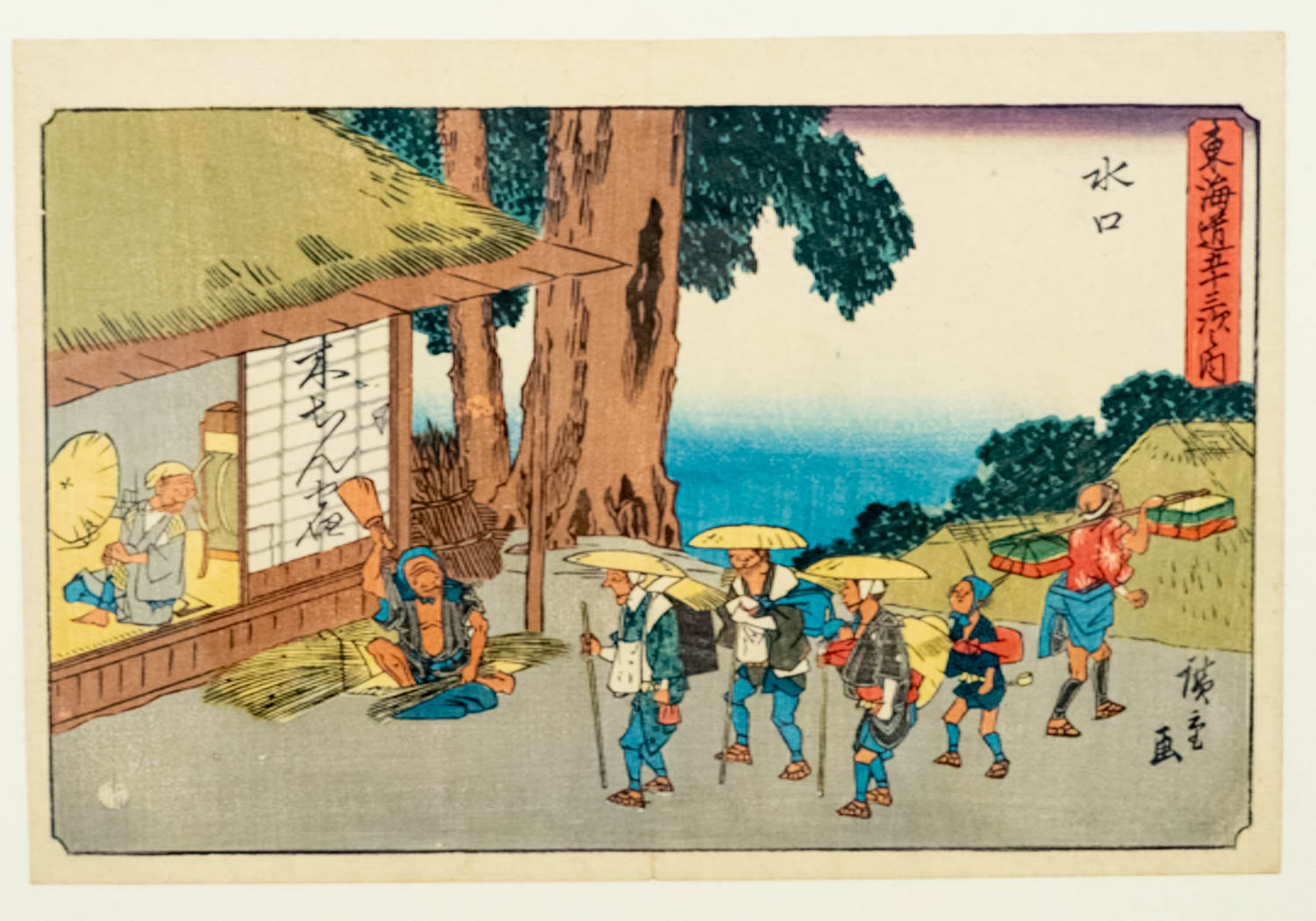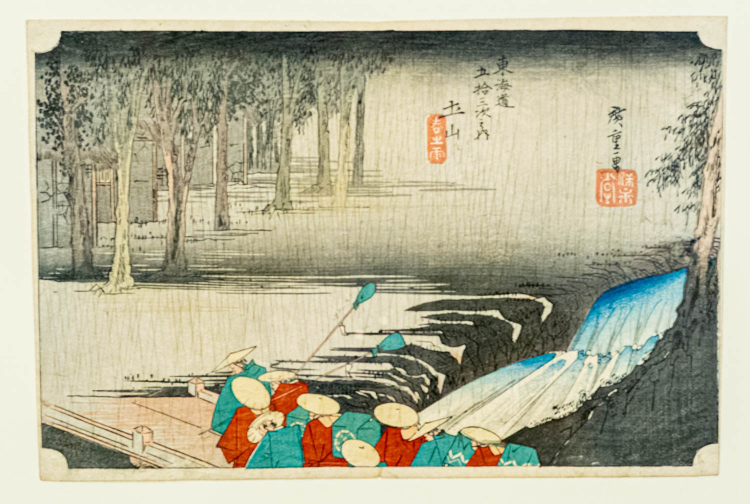 旅人たちは雨具を着用し大きな傘や蓑で身を守りながら小川をわたる