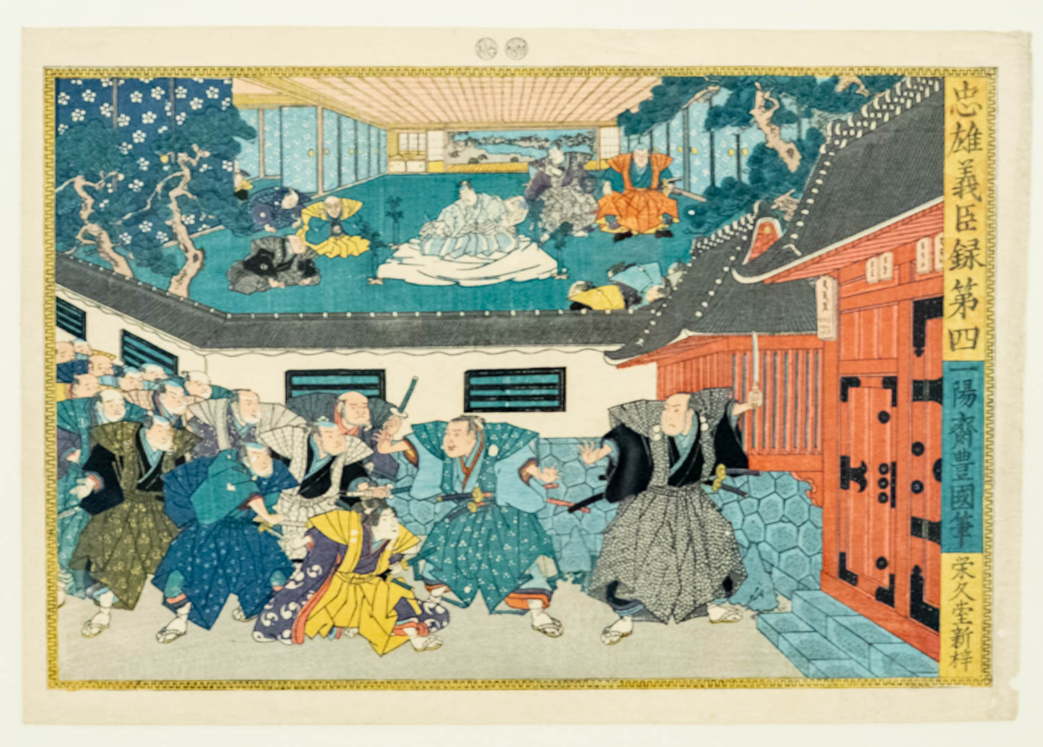 前掲図からの続き。塩冶判官は切腹を命じられ、国許から家老の大星由良之助らが駆けつける。本図は屋敷を境に画面を区切り、判官切腹の場面と閉門した屋敷前に集まる家臣たちを一つの画面に描く。