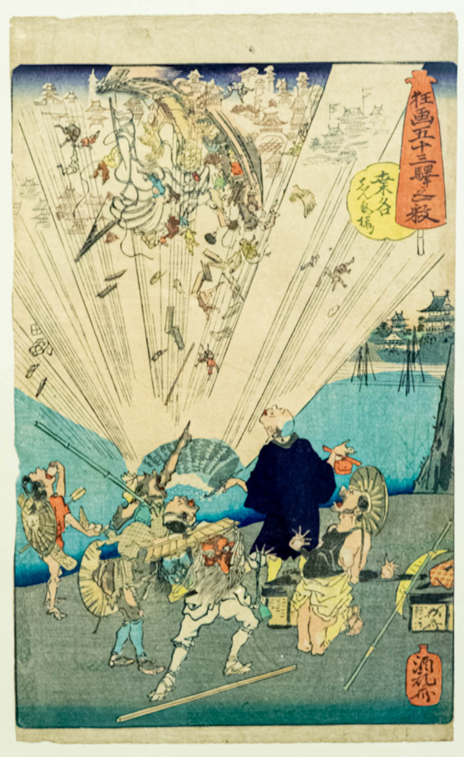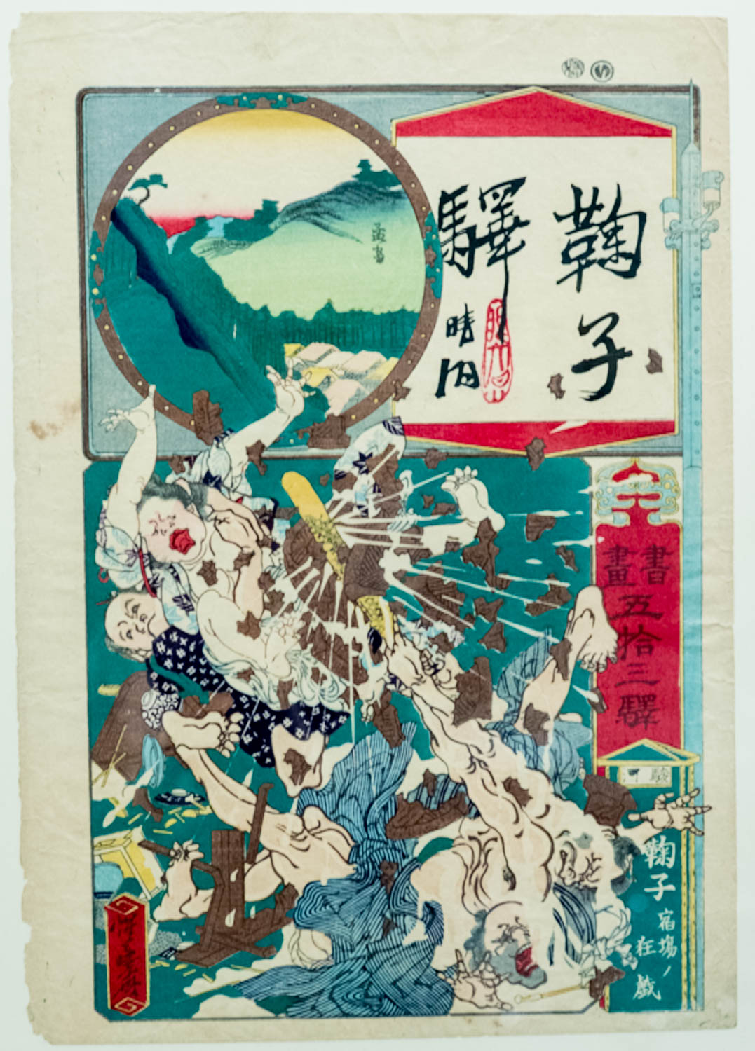 河鍋暁斎・晴湖・孟斎 書画五拾三駅 駿河鞠子 宿場/狂戯 明治5年(1872)