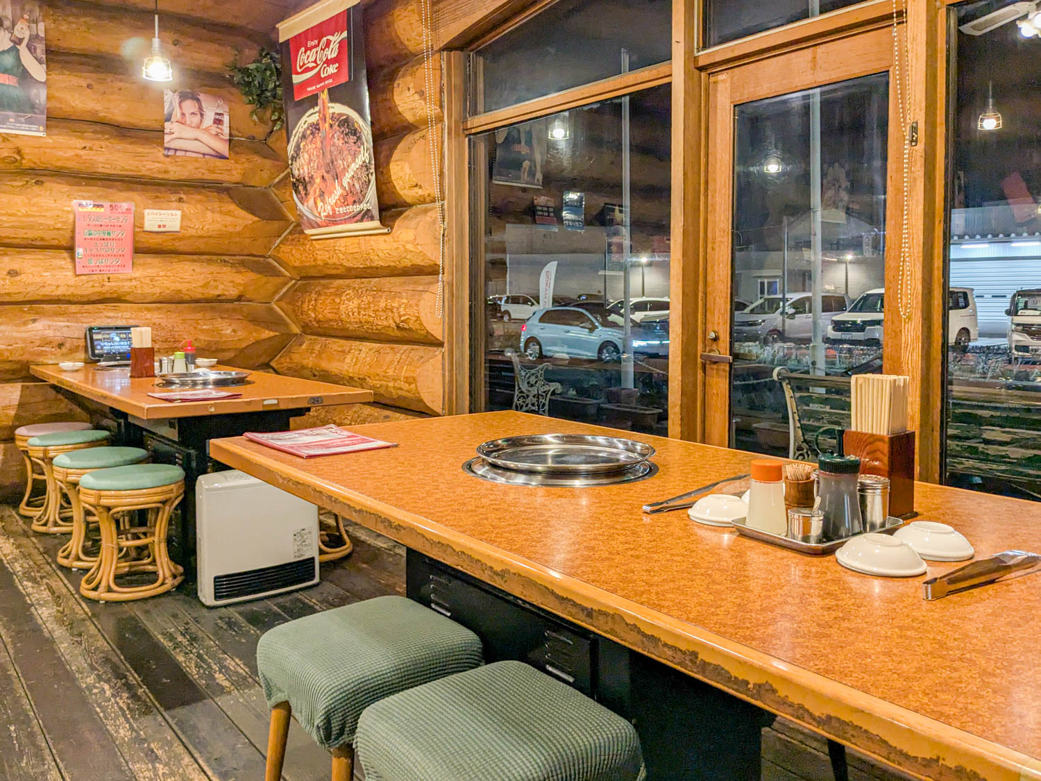 店内はやや古びたウッディ。ここは店名通り。外から見てもログハウスですが、中もしっかりログハウス。