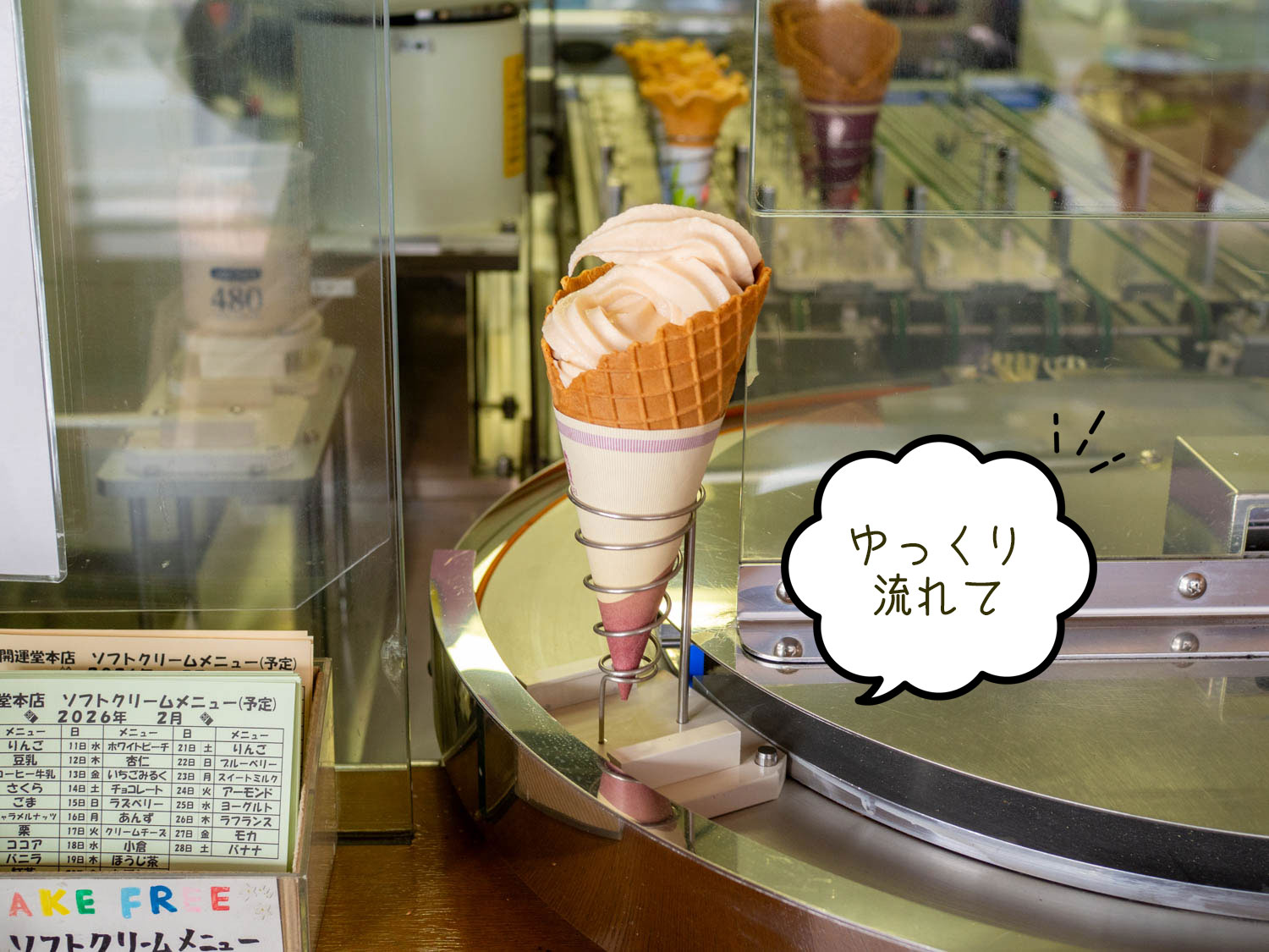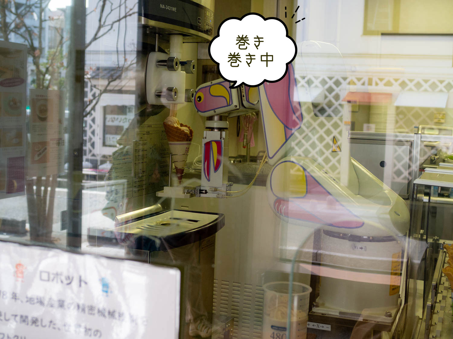 割と昔のマシーンのようです。最近はもっと上手に巻くソフトクリームロボットもいるみたいですが、こちらは「世界初」のパイオニア。