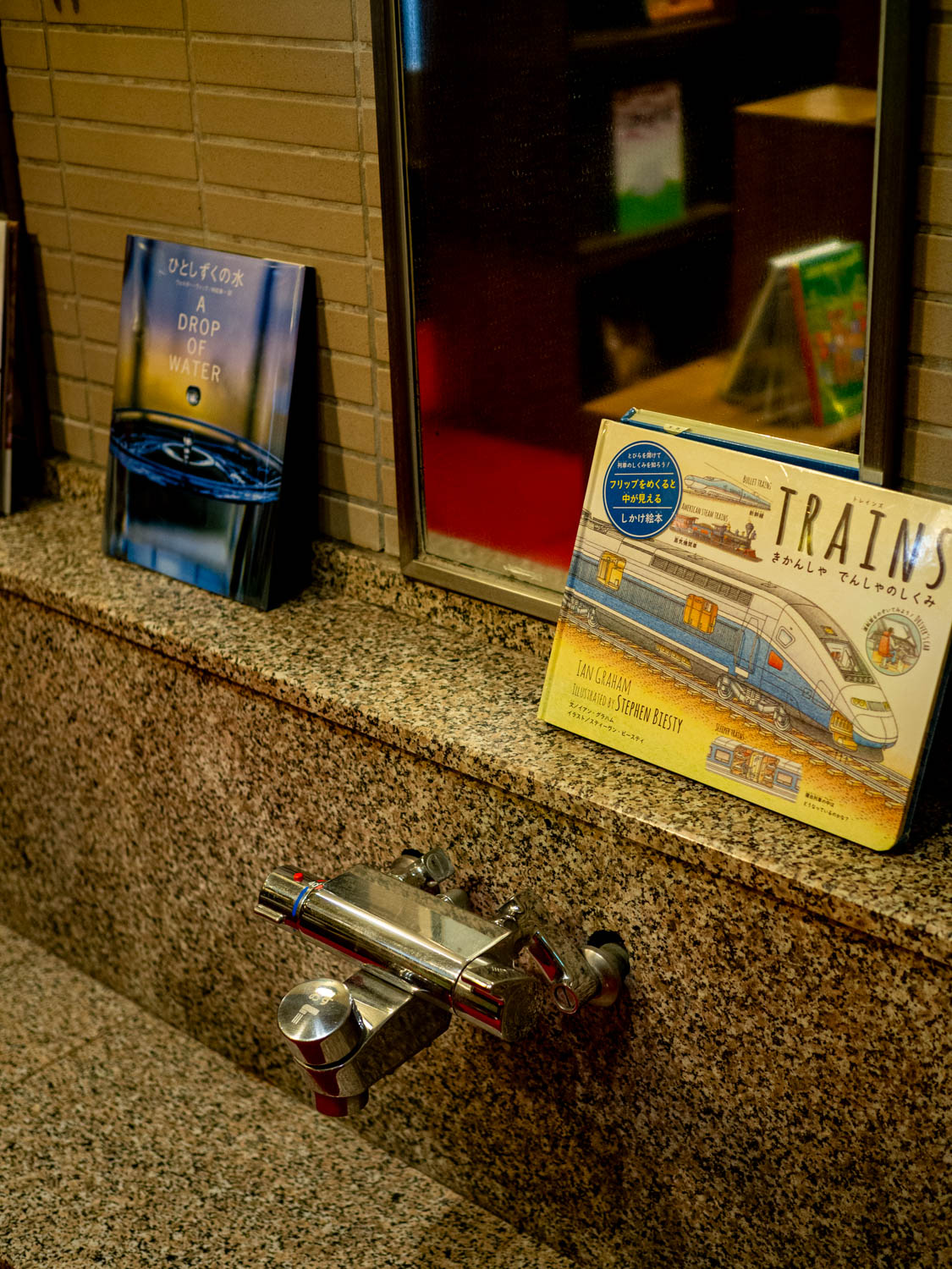 浴槽横や洗い場に、楽しそうな絵本がたくさん貯蔵されていて、風呂に入りながら本を読むと何やら楽しそう…な予感です。大人もやって良さそうです。