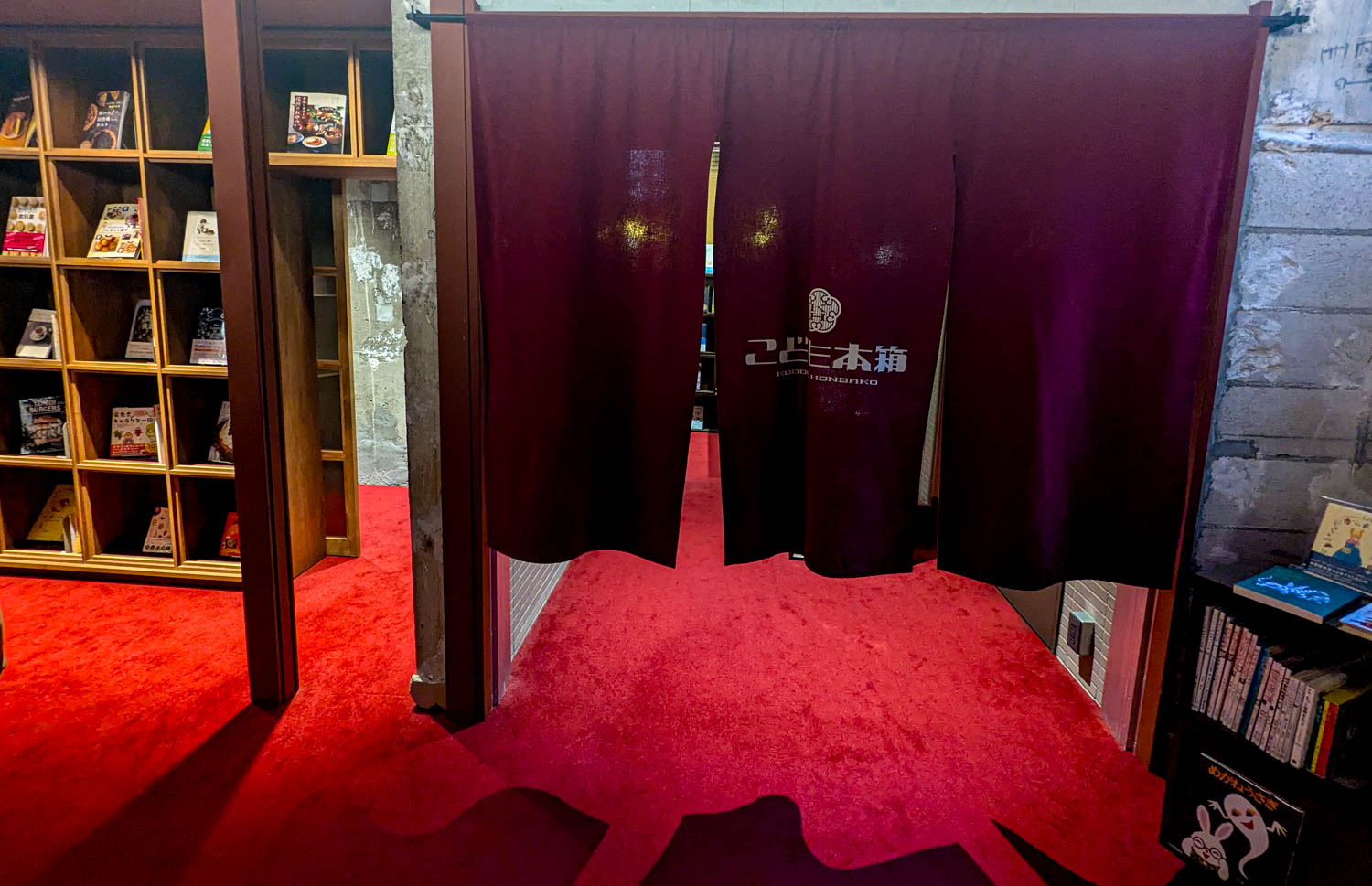 オトナ本箱の階下にあるのが「こども本箱」。同じく大浴場をリノベーションしたブックプールです。洗い場は迷路型の本棚に、浴槽はボールプールになっています。絵本がずらり2000冊。
