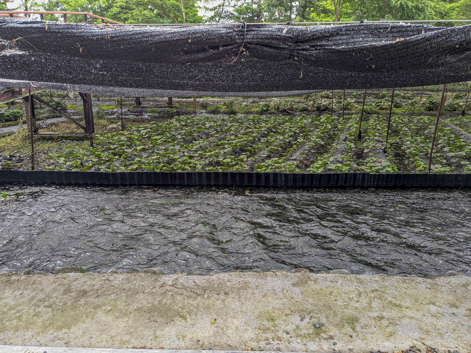 わさび田の横を先程のきれいな湧水がぐいぐいと流れています。