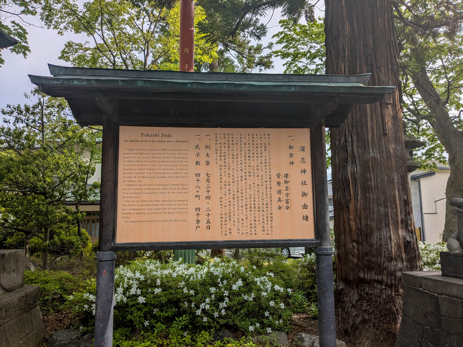 菅原道真公は太宰府天満宮と同じ神様。深志神社は、松本城からは徒歩15分ほど。