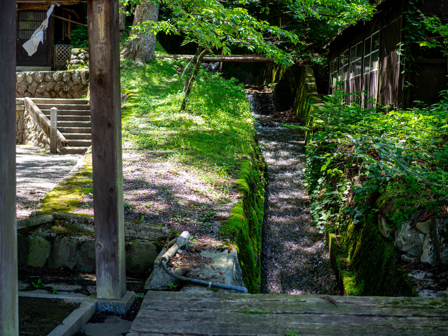 神社の近くに流れる小川は清涼感(ここだけ涼しい)を感じ、マイナスイオンたっぷりで、これはご利益ありそう。