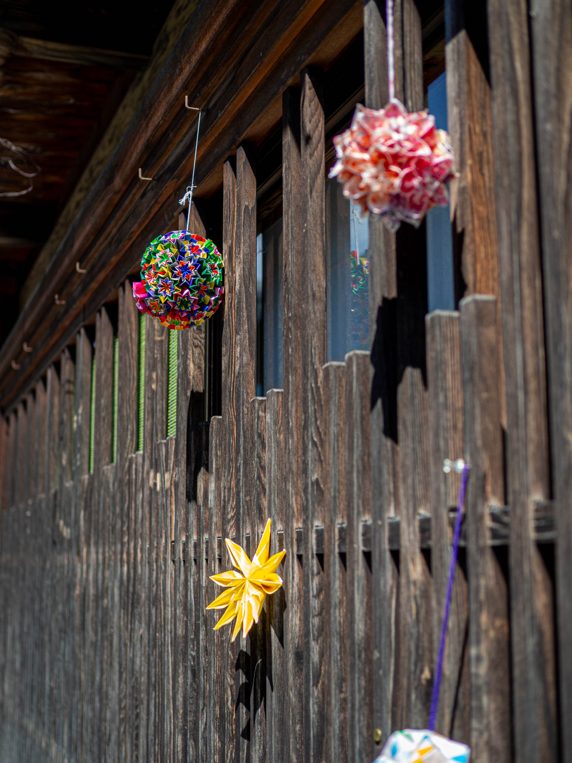 木の格子に飾られた折り紙。