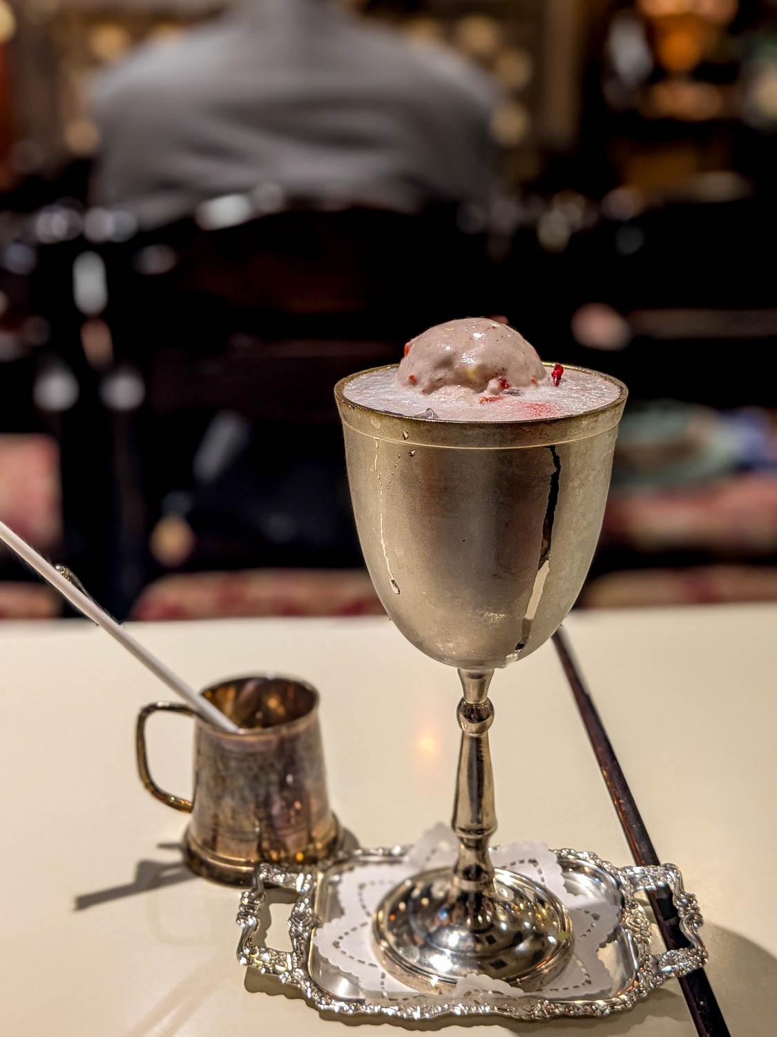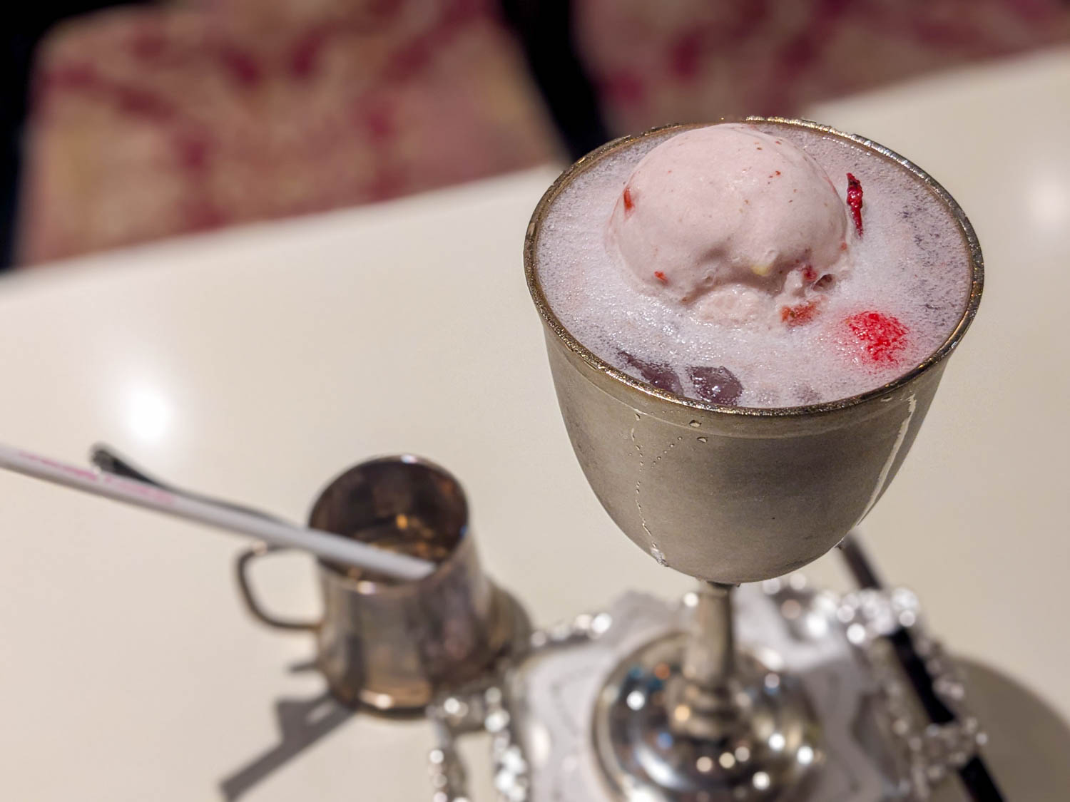 映えを狙ってもいる商品なので、動画をスタンバイ。クラシックな真鍮の水差しからひえっひえのソーダが注がれます。